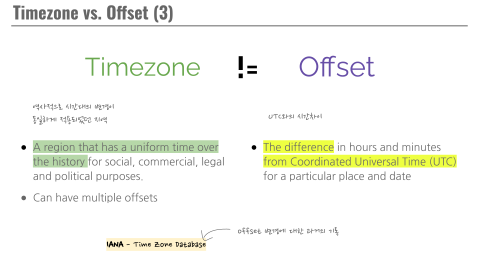 또한, 동일한 `Timezone` 내에서도 일광절약시간제 등의 이유로 시기별로 다른 `Offset` 을 가지기도 합니다.